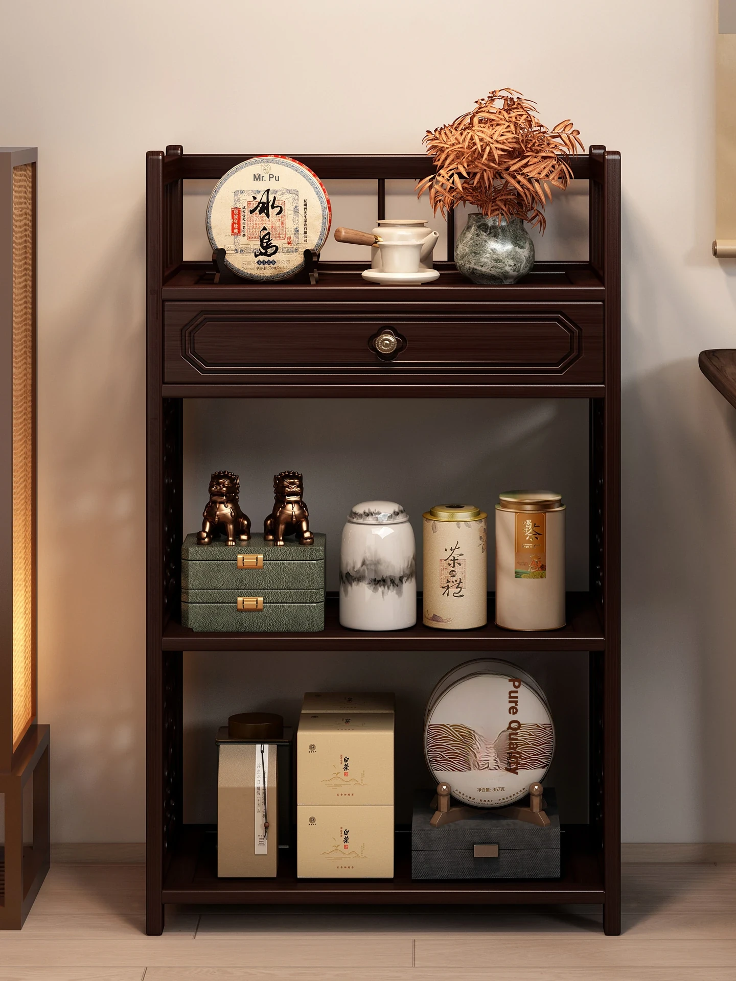 Compact New Chinese Style Tea Rack - Elegant Display Shelf for Tea Sets and Accessories, Perfect for Tea Rooms and Living Rooms, Ideal Storage Cabinet for Tea Leaves and Decorative Items