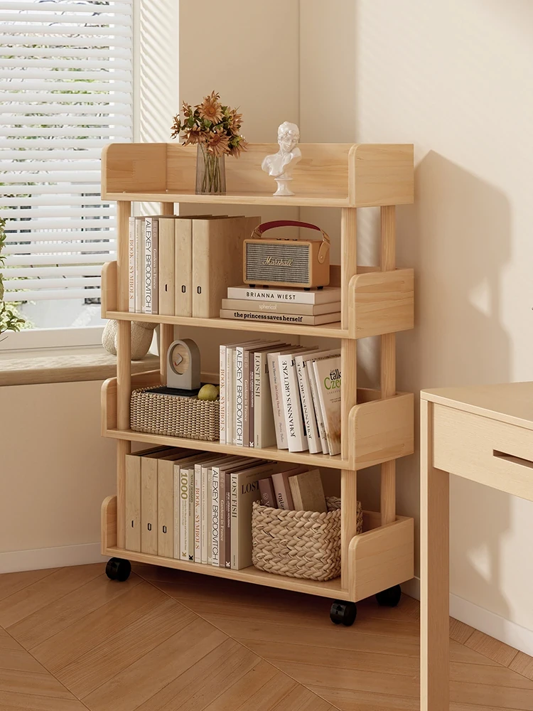 Movable Wall-Mounted Solid Wood Bookshelf - Space-Saving Multi-Layer Storage Rack for Kids with Wheels, Easy Assembly and Versatile Design