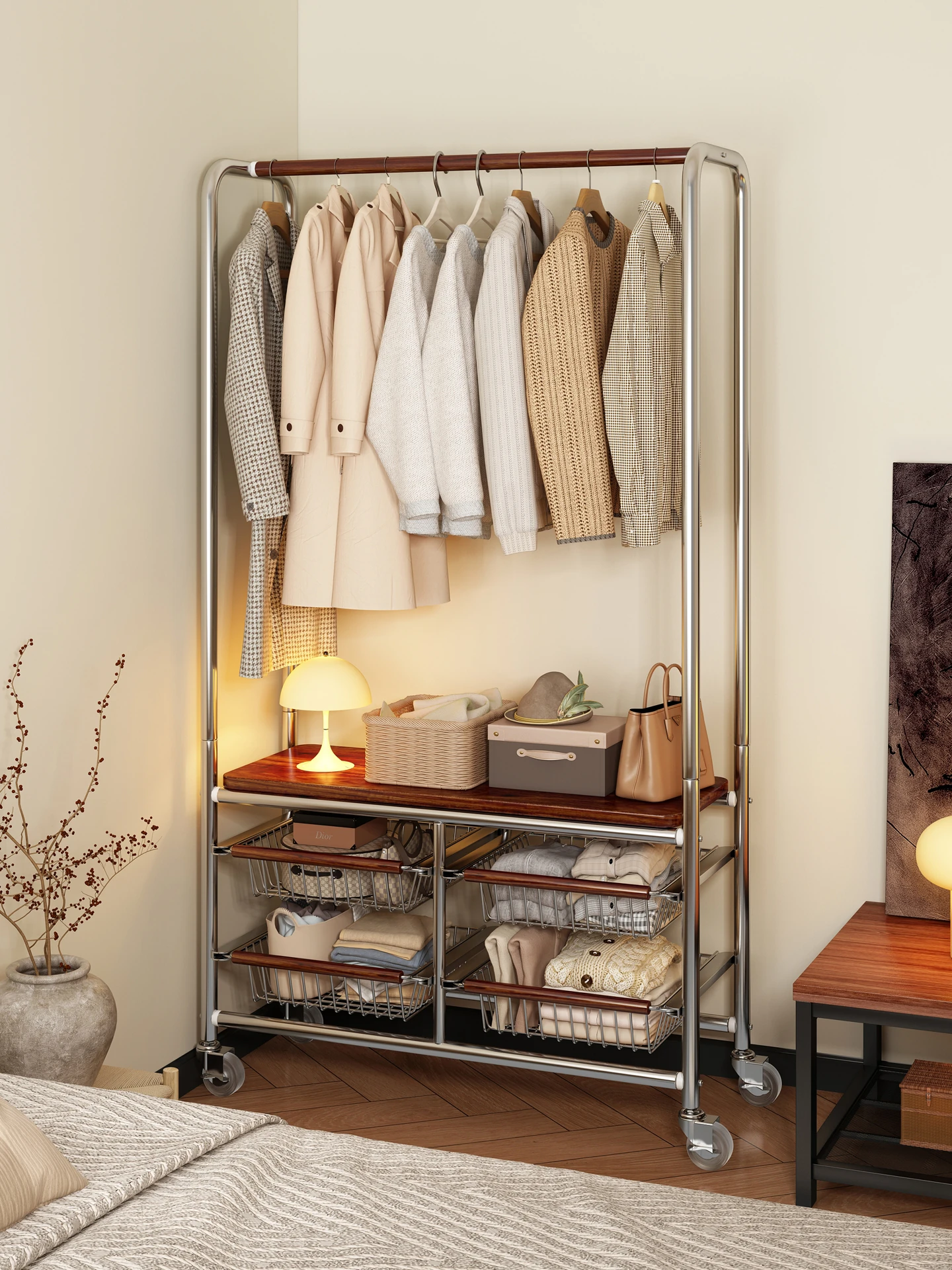 Stylish Mobile Metal Clothing Rack for Bedroom - Versatile Floor Hanger and Storage Organizer for Entryway, Perfect for Coats, Bags, and Hats - Ideal for Vintage Clothing Lovers