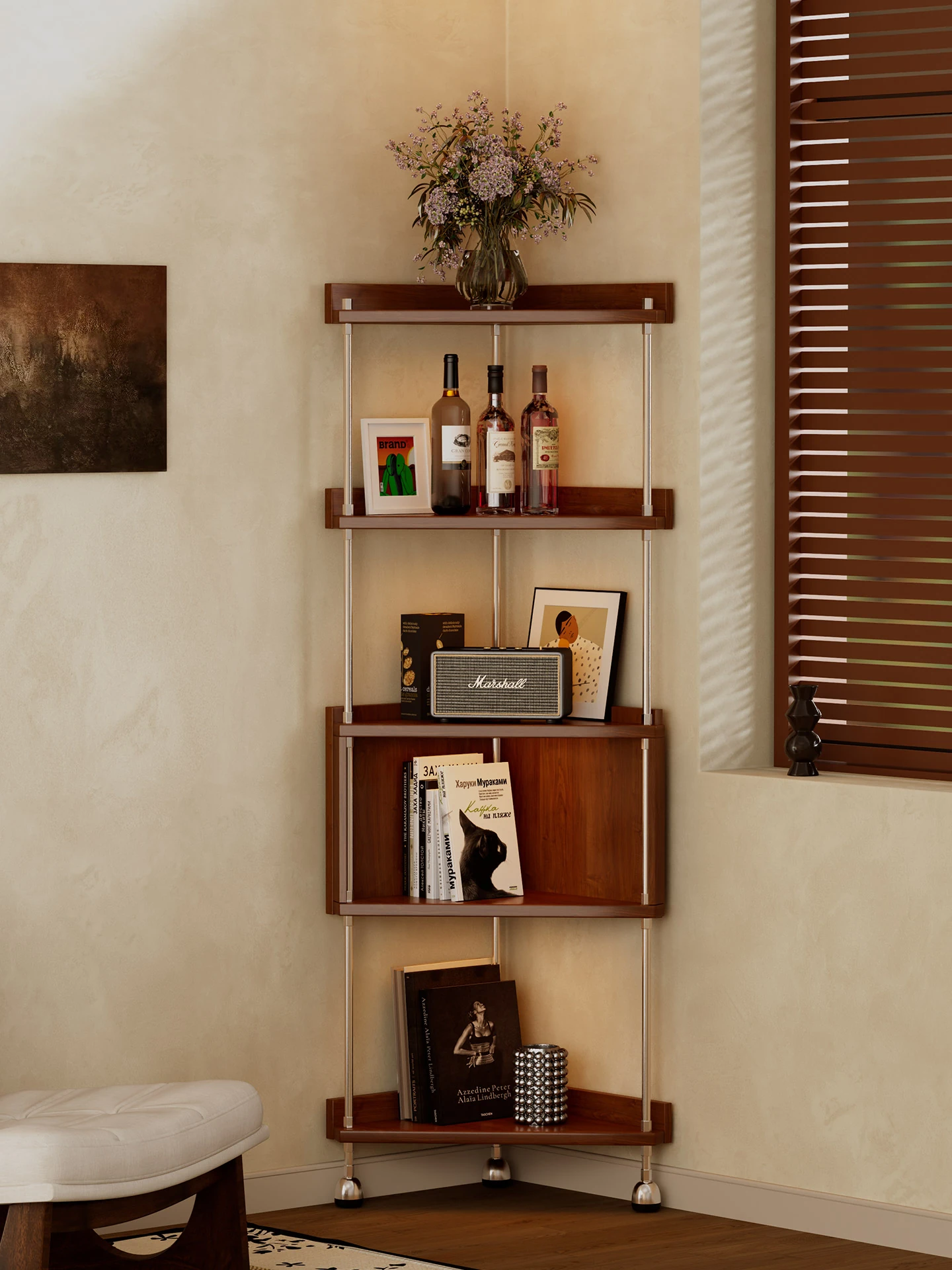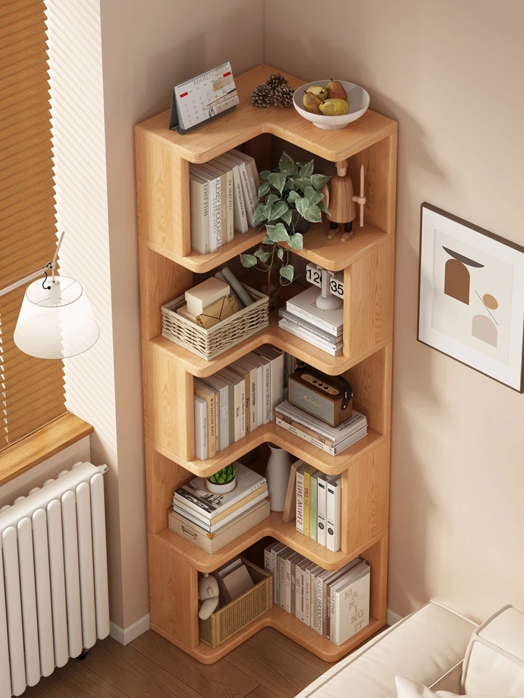 無垢材のコーナー書棚 - リビングにぴったりの収納力抜群なフロアスタンド型!壁角を有効活用し、すっきりとしたディスプレイを実現。書籍や小物を美しく整理整頓できる、スタイリッシュな一体型収納家具です。