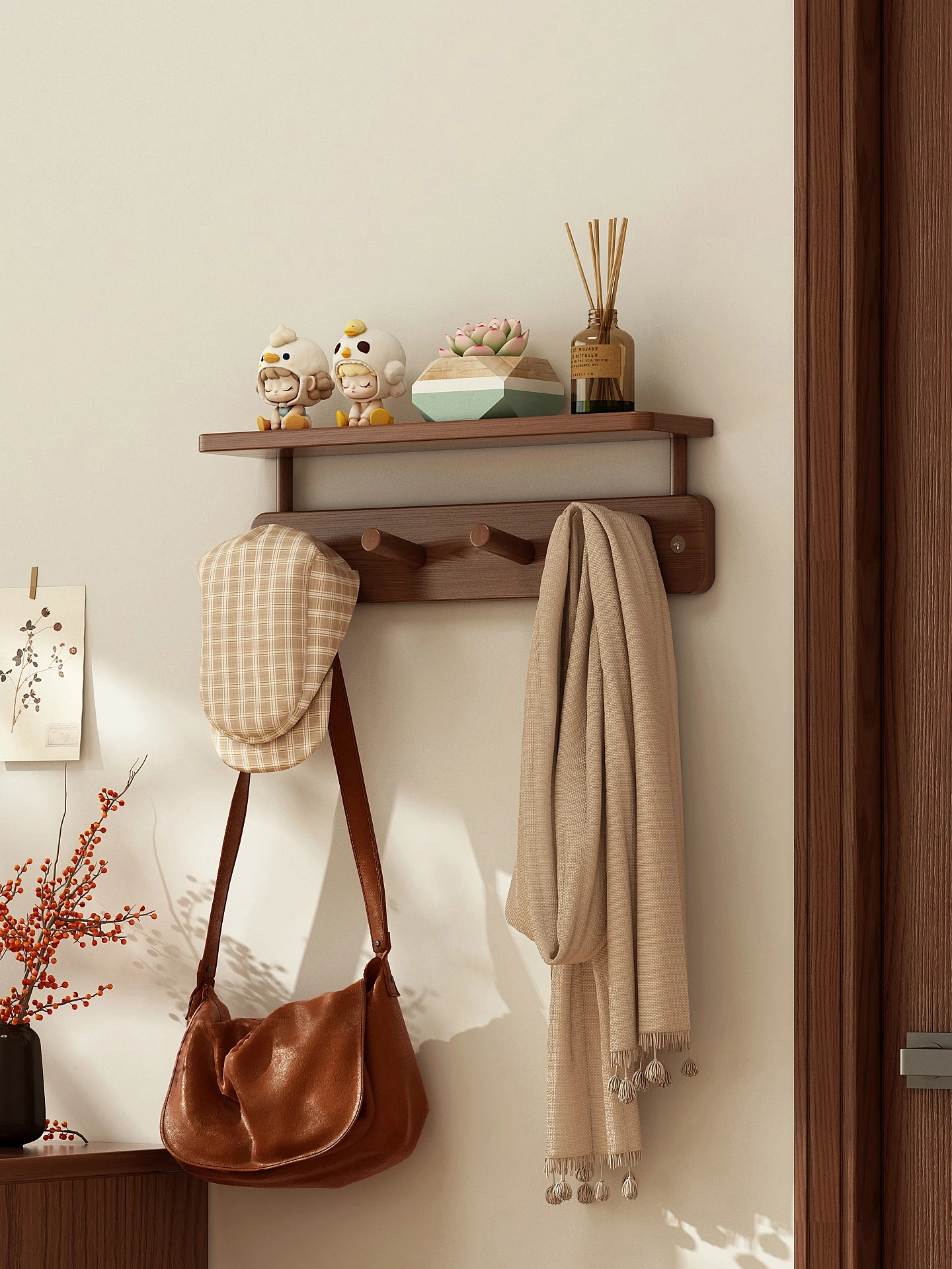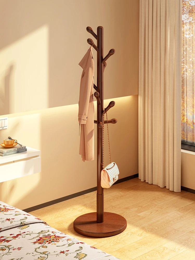 天然木材使用のスタイリッシュなコートハンガー!玄関や寝室にぴったりの床置きタイプ。ベッドの足元にも置ける小型サイズで、バッグや衣類をスマートに収納。おしゃれな空間を演出する必須アイテム!