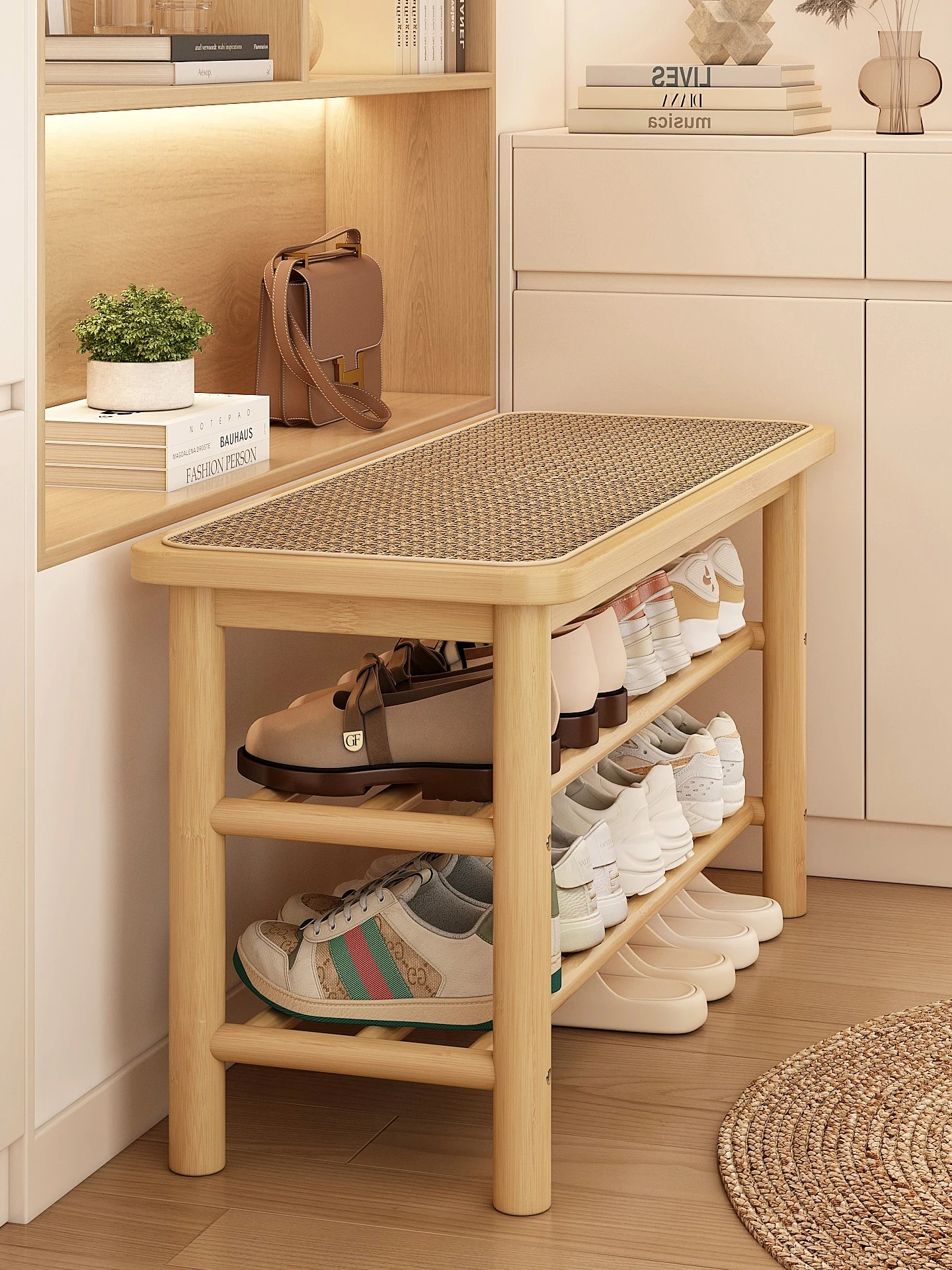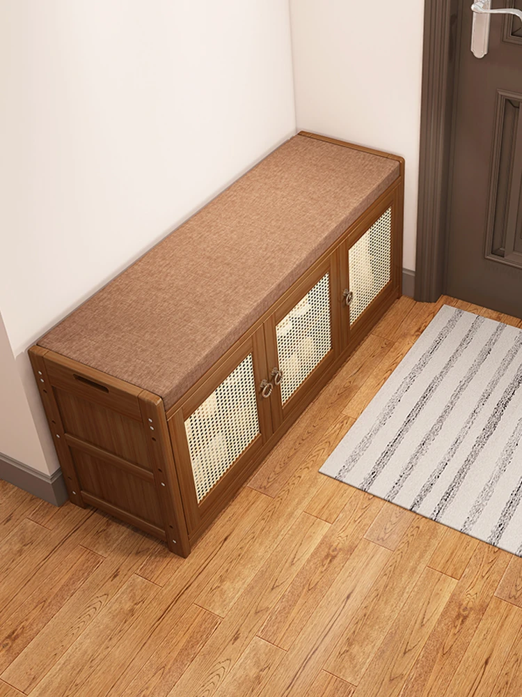 玄関用スツール一体型シューズボックス - 藤編デザインでおしゃれな靴を履くためのベンチ!狭いスペースにも最適、家族やゲストをお迎えするのにぴったりです。快適な座り心地で靴の脱ぎ履きが楽々!