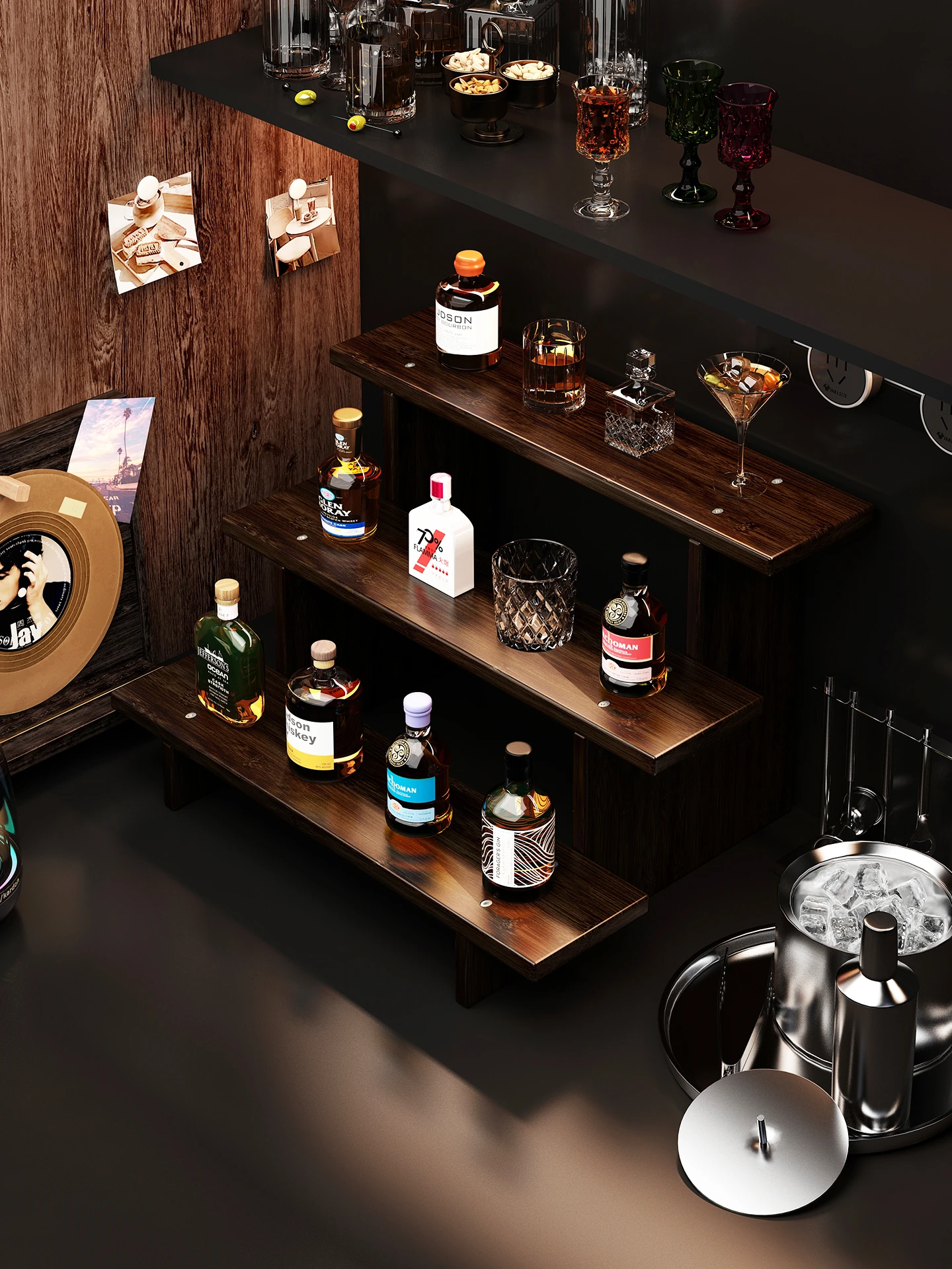 多層階段式デザインのデスクトップワインラック - おしゃれなバーにぴったり!ワイングラスや洋酒の展示・収納に最適な収納ラック。あなたの空間を華やかに演出します!