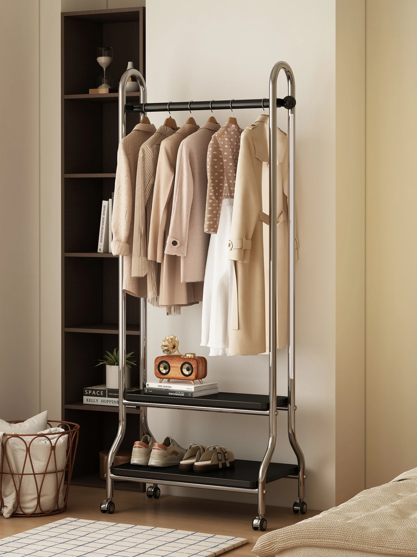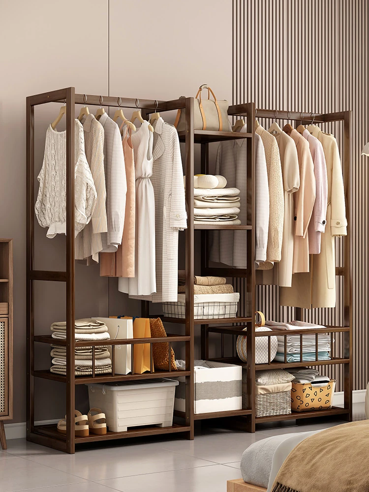 寝室用スタイリッシュな木製ハンガーラック - 移動可能で便利!玄関やベッドサイドにぴったりの衣類収納。シンプルなデザインでお部屋をおしゃれに演出し、すっきりとした空間を実現します。