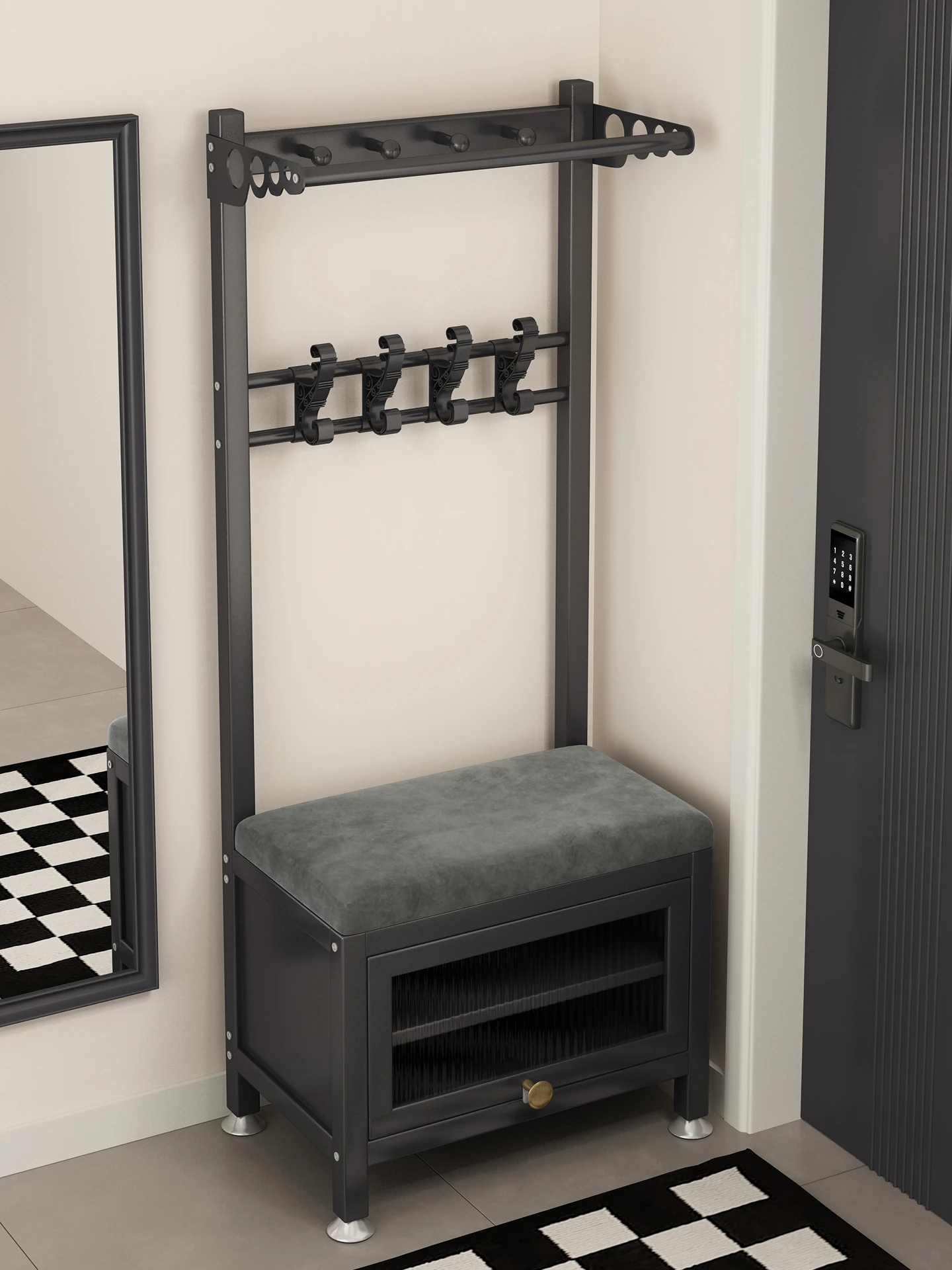 玄関にぴったり!省スペースの多機能ハンガーラック - コート掛け、靴ベンチ、帽子スタンドが一体化したスマート収納で、スッキリしたエントランスを実現!