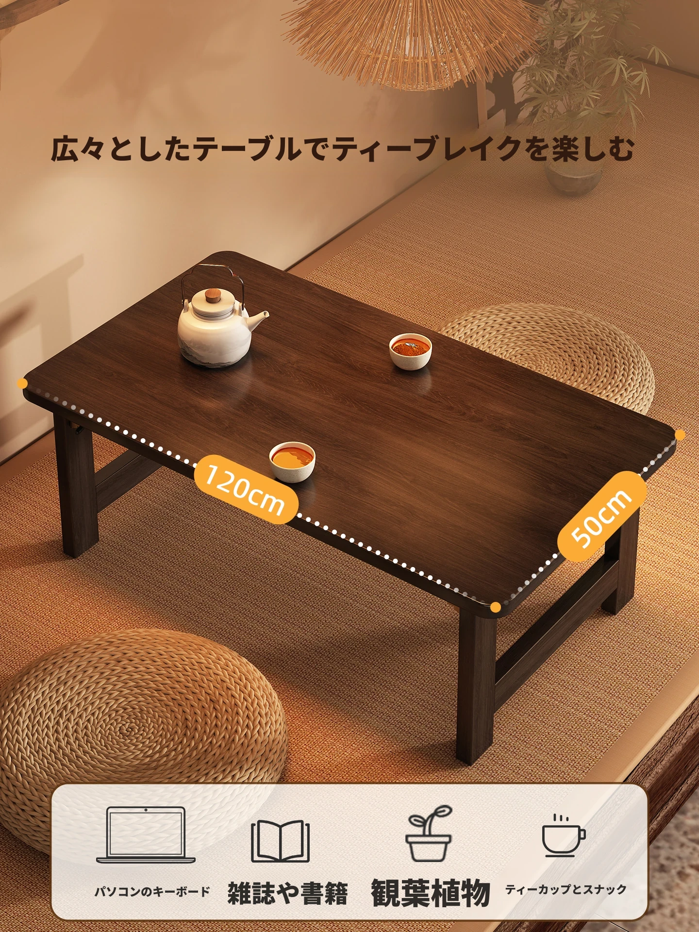 折りたたみ可能な小型テーブル - 寮生活や自宅での勉強に最適!長方形デザインで、窓際や畳の上でも使える便利なローテーブル。お茶や軽食にもピッタリ!収納も簡単で、スペースを有効活用できます。